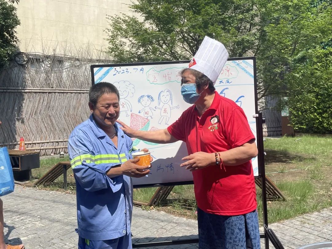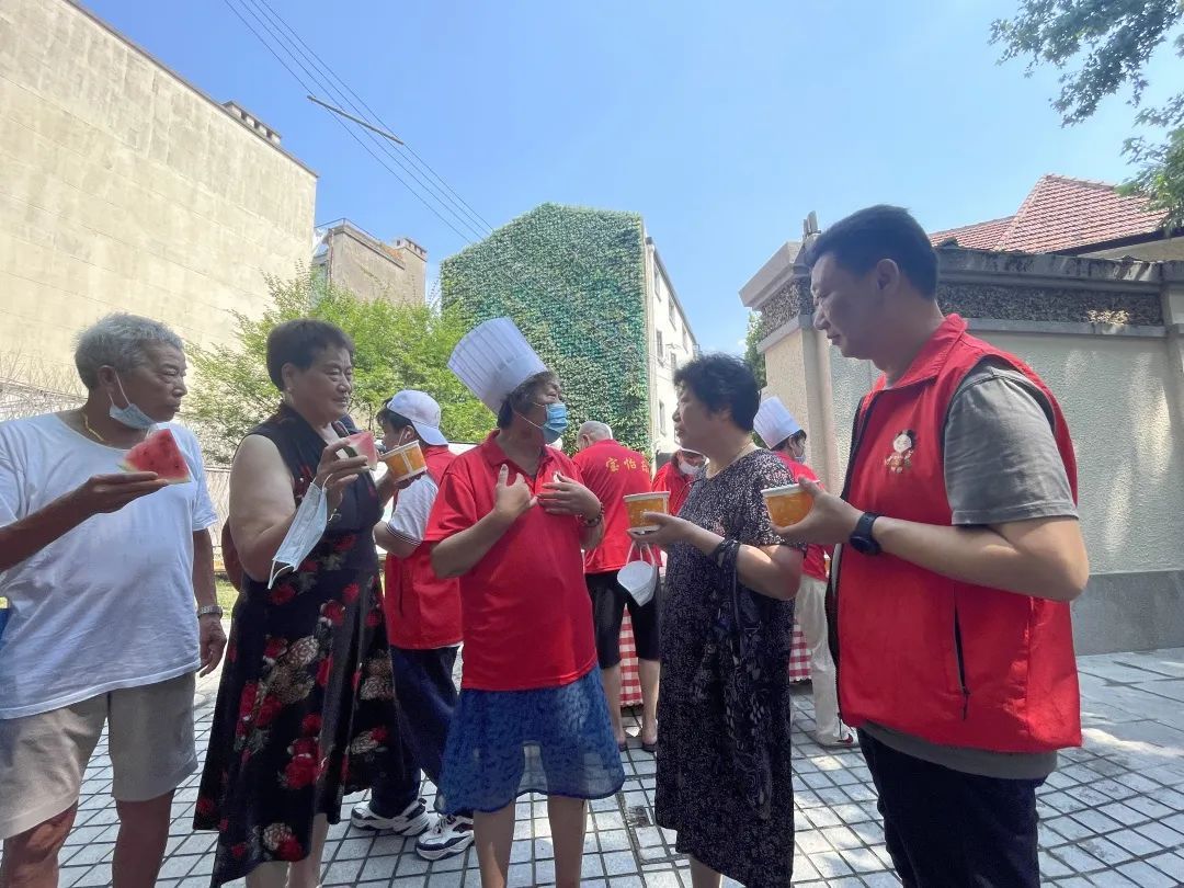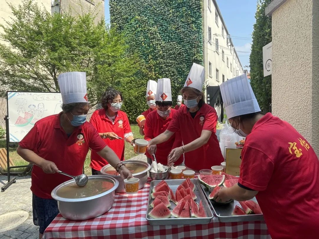 她们都是徐汇“宝怡乐”志愿服务队,今天趁着高温天,专为户外工作者和社区孤老们送清凉。周边的快递小哥、环卫工人和城管们有些是第一次来,有些则是“老面孔”,十几年来,每逢高温天,都能来这喝上一碗解暑的绿豆汤。
