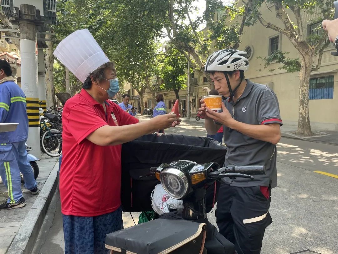快递小哥小孙送货时经过,就被阿姨们热情吆喝来,他告诉记者:“吃了冰西瓜,喝了绿豆汤,感觉很舒服!”已经在永嘉路负责十多年环卫工作的周阿姨说道,“虽然天气很热,但是我们感觉很清凉,真的很感谢她们。”社区老人则表示,“天冷送赤豆汤、天热送绿豆汤,每个节日她们都会做,坚持下来很不容易!”