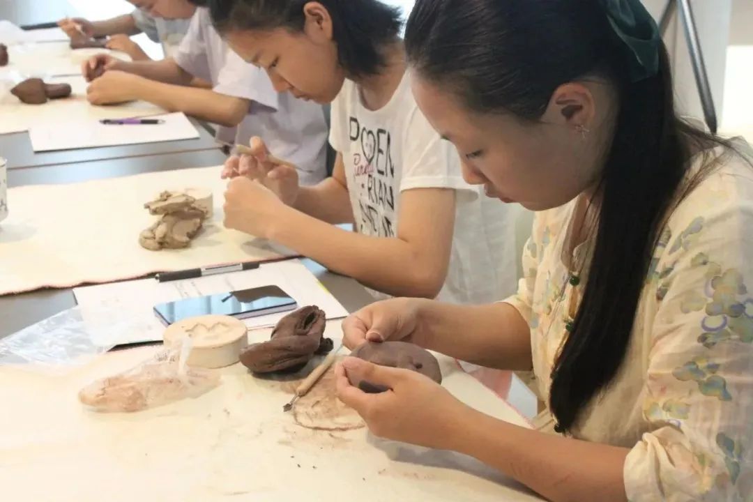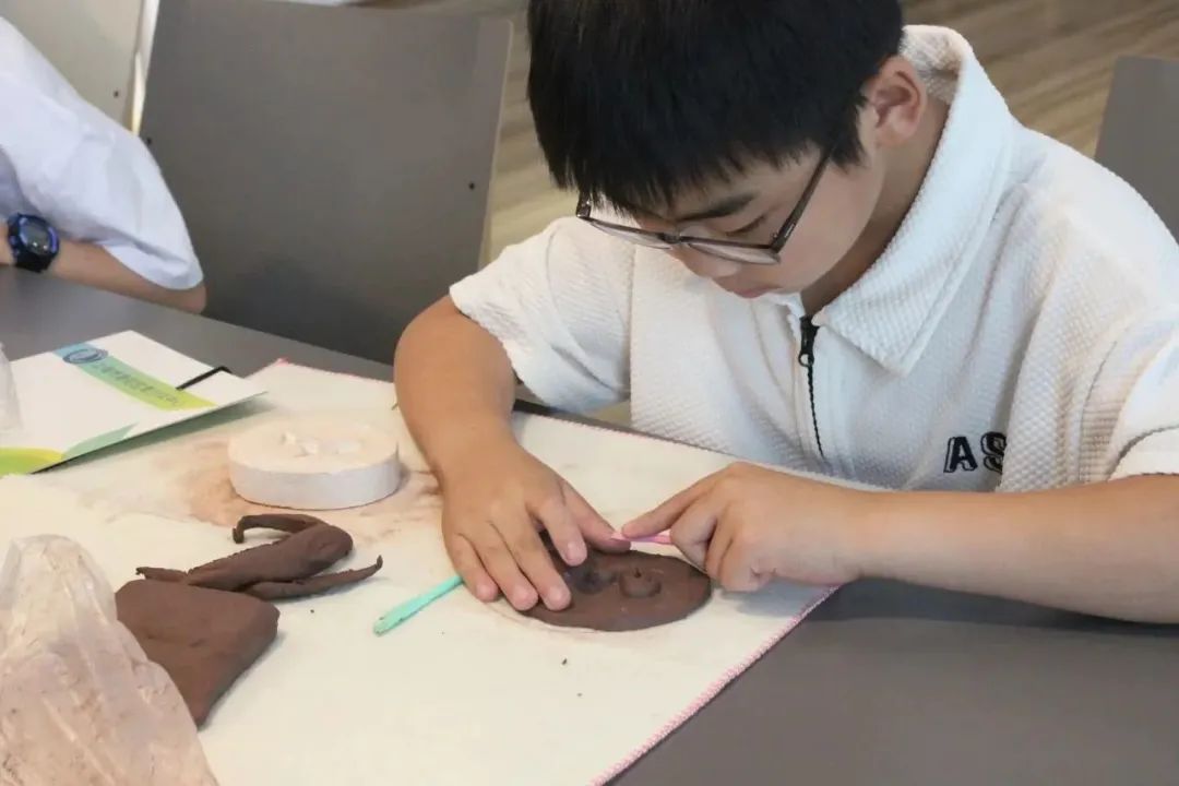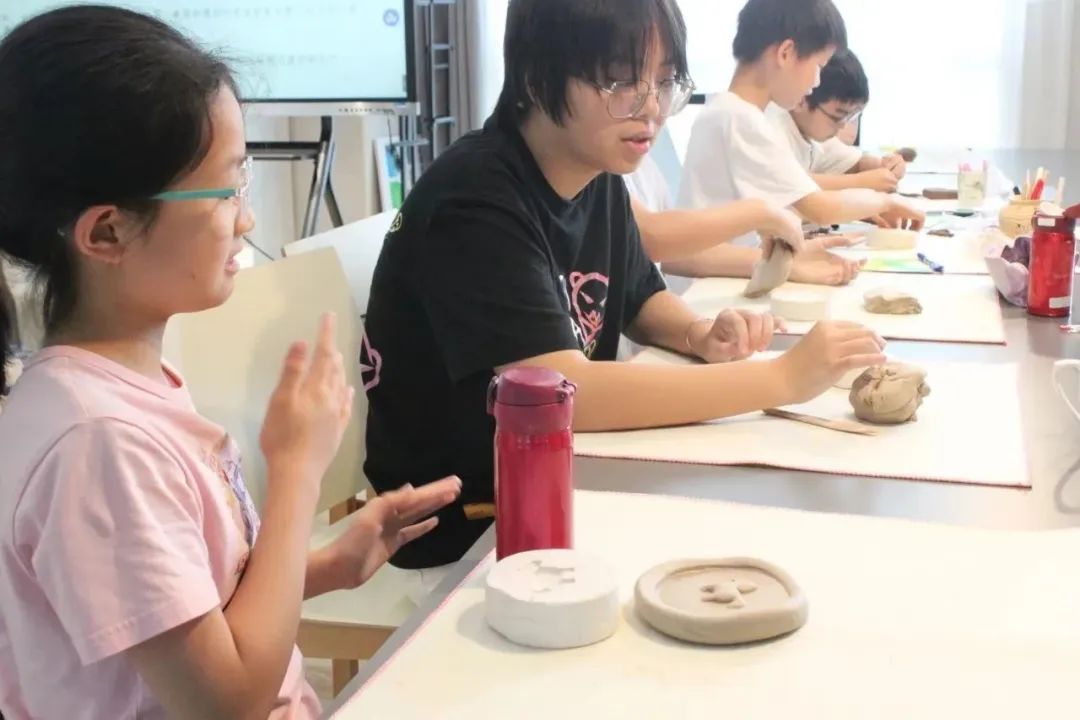 “徐老师,为什么有的泥土按压时会开裂,有的不会?”“为什么印坯后的泥土表面有一层小裂纹?”……同学们通过选取不同颜色的泥土进行印坯实验,观察泥土通过按压塑形、吸水脱模后的外观形态,对比泥土可塑性的变化,结合制作体会,纷纷与徐老师展开热烈的讨论。
