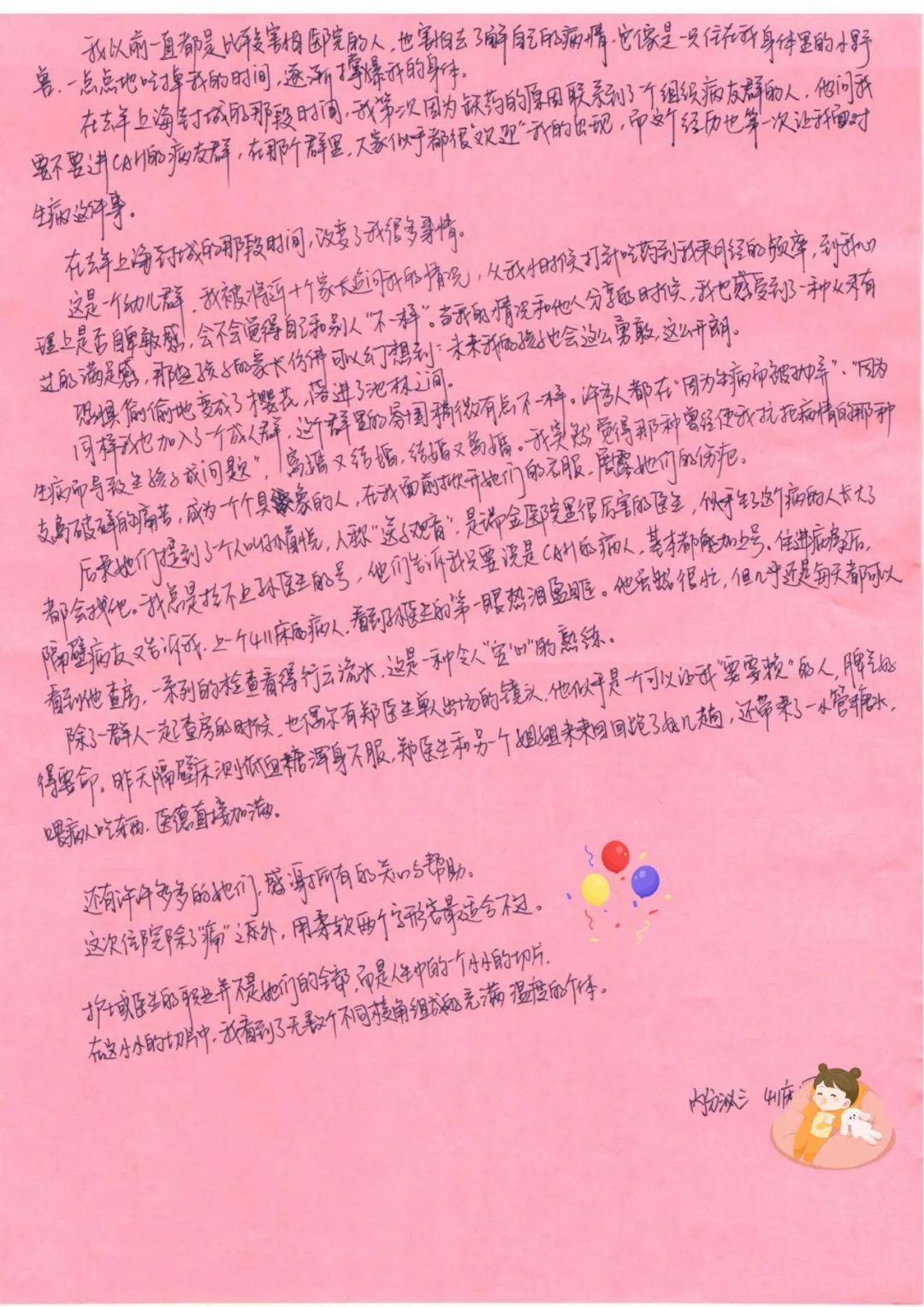 患者名叫小愉(化名)今年22岁,是一位先天性肾上腺皮质增生症(CAH)患者。其实,小愉3岁时,父母就发现了她的与众不同。近20年时间里,小愉在与疾病抗争的过程中,也懂得了人生的意义。她不仅加入病友群“现身说法”,为她们带去信心,同时也结识了瑞金内分泌科的医护团队,于是才写下这封与众不同的感谢信,字里行间映着豁达幽默与洒脱。