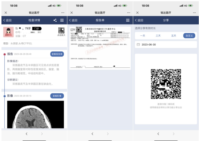 为了保护个人隐私,扫描检查报告中的二维码后需要填写患者的身份证号后四位,密码正确后才可以“通关”,影像报告的分享功能也可以自定义有效期,3天、5天、1个月……都没问题。