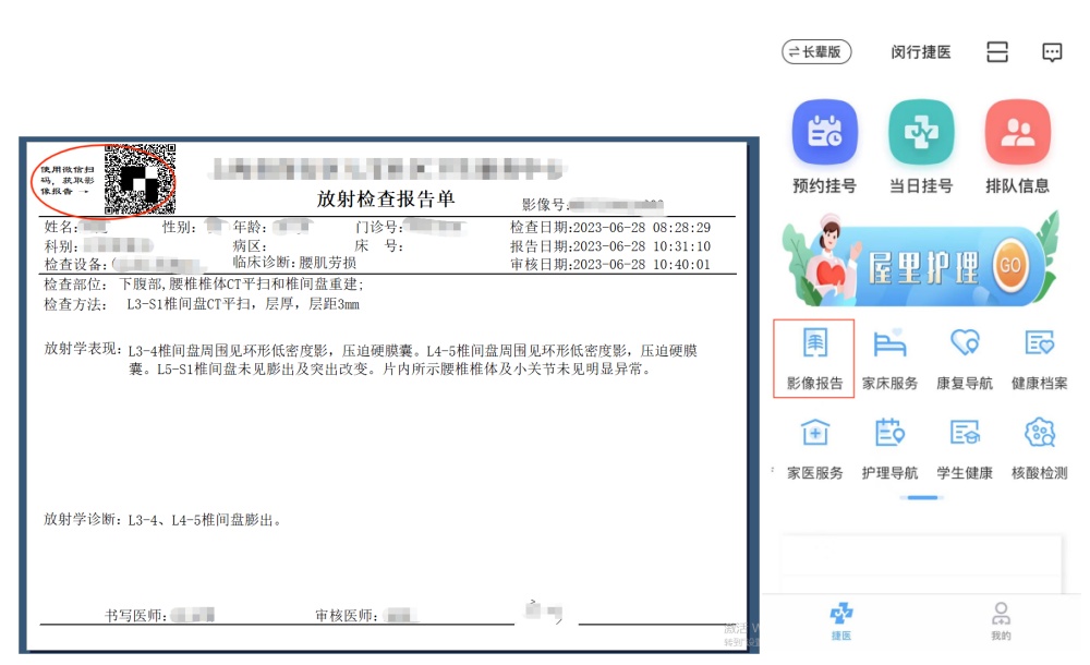 患者在医院做完CT、核磁共振等影像检查后,可通过纸质报告单左上角的二维码直接扫描或通过“闵行捷医”首页“影像报告”模块进入,实现随时随地调阅、下载、分享检查报告及符合诊断标准的影像胶片 (无损DICOM原始影像) 。