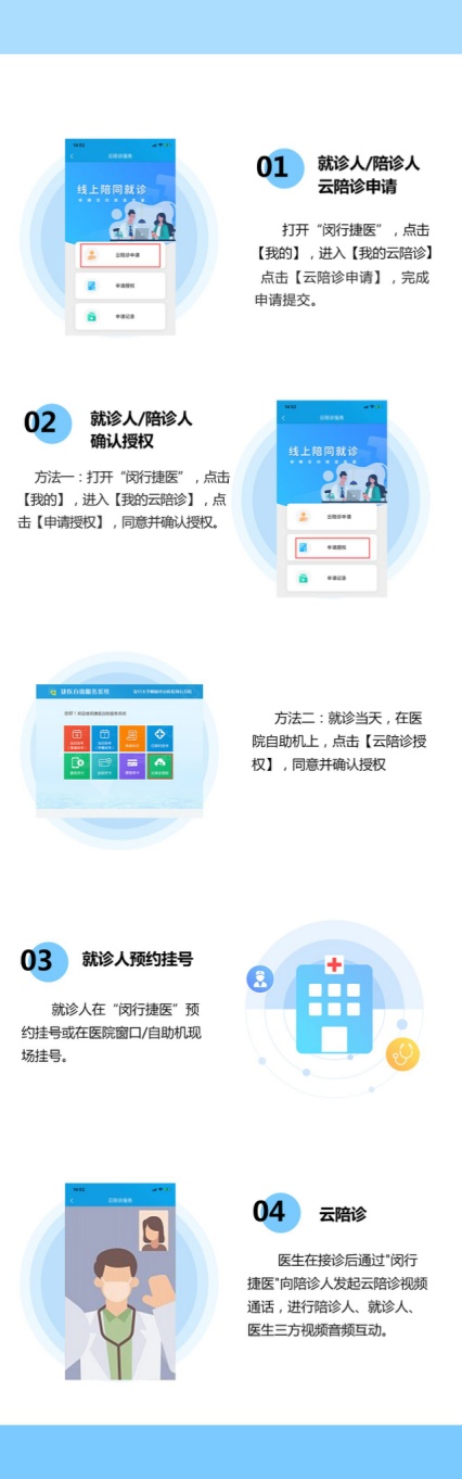 患者可以指定云陪诊人,双方通过“闵行捷医”APP中的“我的云陪诊”功能,进行互相申请、授权,即可实现全程线上陪诊。云陪诊人可以与接诊医生线上视频沟通,远程了解患者当前就医状态,实时收取患者的挂号成功、就诊状态、取药信息等消息,为患者提供更好的就医体验。