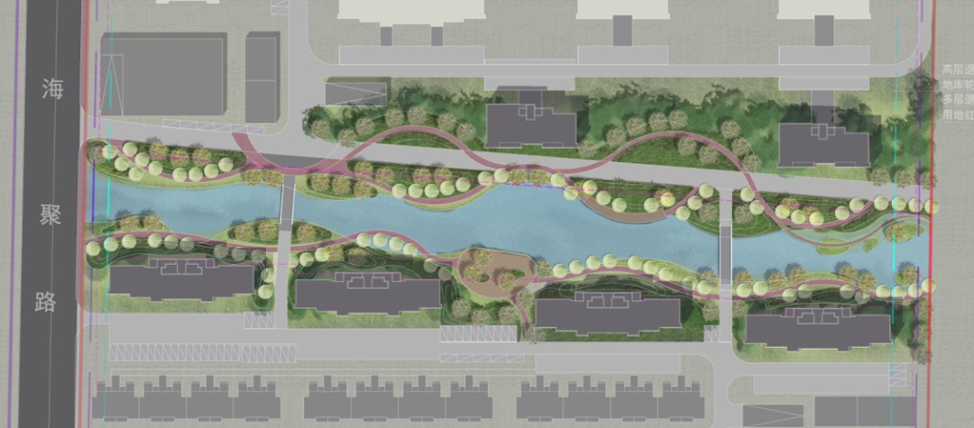 图4:地块内保留河道意向方案与建筑关系示意图