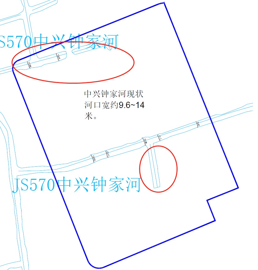 地块内有现状河道中兴钟家河,长约415米,河口宽约10-13米,河道面积约4650平方米。中兴钟家河水体编码为JS570,河道起讫点为红旗港河道-战斗港河道,河道总长度约2652米,总面积约28280平方米,连续穿过1-03A-01、1-03B-01及杭州湾大道东侧地块(见图2)。
