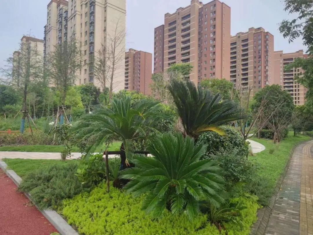 跨过小桥,几处绿植造景便映入眼帘,一侧有紫红色的花卉与绿色圆球状的景观树木点缀在草坪间,造景小巧而精致;另一侧则种有铁树,颇具夏日气息。