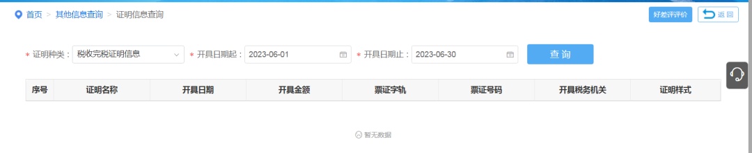 点击【车辆完税证明(电子版)查询】,进入该模块后,证明种类中下拉框选择“车购税完税证明”,输入查询车辆的车辆识别代号,确认开具日期起止,点击“查询”。