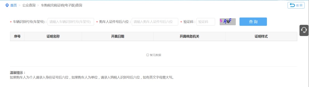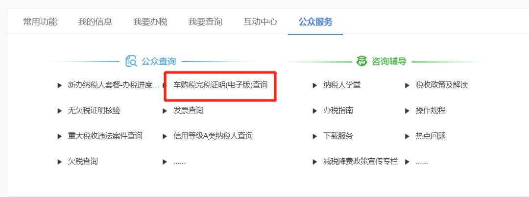 通过【公众查询】中的【车购税完税证明(电子版)】模块免登录查询打印完税证明(电子版)。