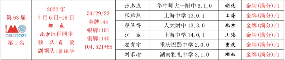 另一名来自上海中学的选手孙启傲和来自湖南师范大学附属中学的梁行健、浙江省宁波市镇海中学的张鑫亮、深圳中学的姜志城也都获得了金牌。