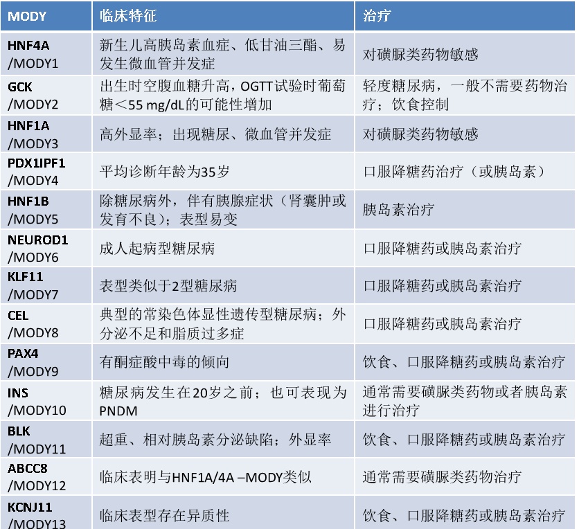 MODY的不同亚型在发病年龄、高血糖情况和治疗方案各不相同,大多数患者口服药治疗便可使血糖达标。