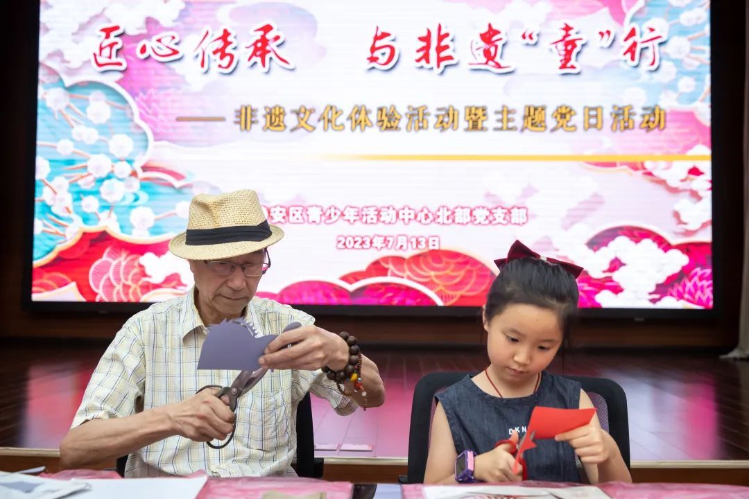 7月13日,阳曲路上的静安区青少年活动中心小剧场内人气旺盛,一场主题为“匠心传承 与非遗‘童’行”的非遗文化体验活动暨主题党日活动正在热闹进行。