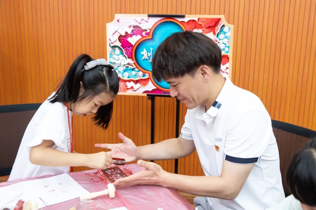 为了让孩子们学得尽兴,活动中心的党员教师们精心设计、推出了生肖剪纸、竹编香囊、水拓团扇、刻板印刷、珐琅嵌簪、鎏金点翠和面塑“布老虎”7种非遗体验项目,还特邀王氏海派剪纸传承人王建中大师亲临现场指导。
