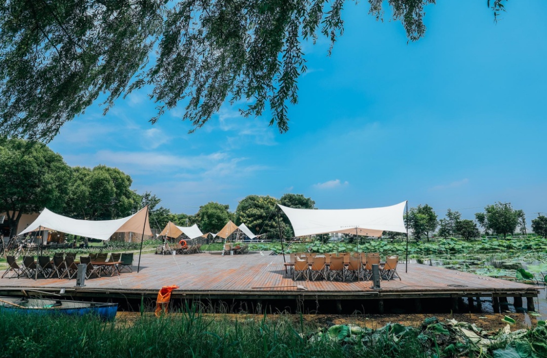 湖面上一片绿意盎然的荷叶簇拥而生,河边手握鱼竿的人群纵情投掷……随着乡村游的火热,位于金山区枫泾镇中洪村的开普丁露营地越发热闹起来。