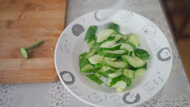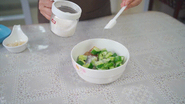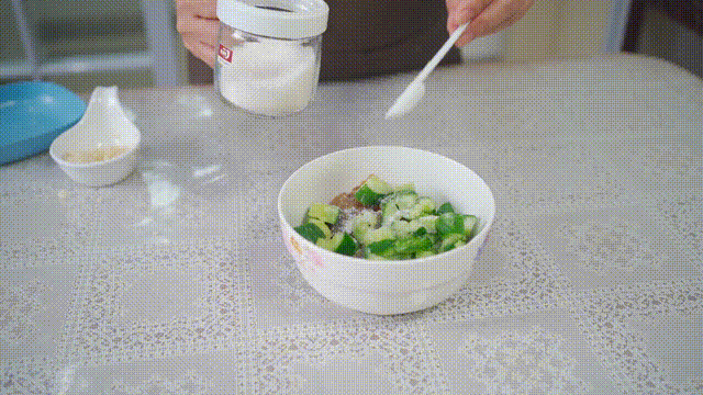 3.加入少量盐将黄瓜腌制5分钟,腌出黄瓜的水分,口感更脆爽。