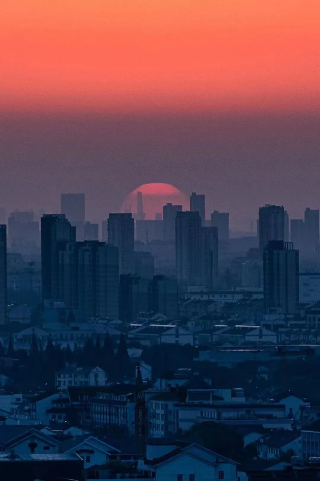 从苏州市区拍摄上海中心日出 摄影:张光科