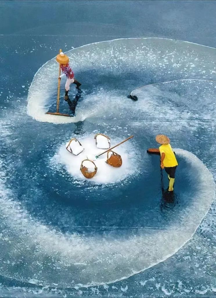 花岙岛上还保留着象山境内仅存的一片原始晒盐场,在晶莹剔透的盐田里,盐农们不断重复着古法晒盐、采盐的活动。一块块大小不一的盐田整齐排列,映衬出湛蓝的天空,宛若“天空之镜”一般。