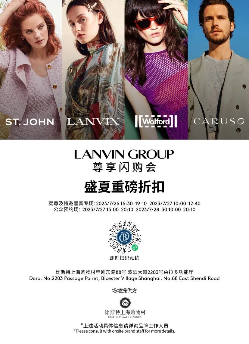 Lanvin Group 旗下四大奢侈品牌齐聚-法国历史悠久的高级时装屋 LANVIN 神秘折扣、奥地利高奢贴身服饰品牌 WOLFORD全场 2 折起、美国奢华女装品牌 St. John全场 1折起,以及意大利高端优雅男装CARUSO全场 2 折起,还有惊喜福袋多件多折,更多礼遇等您莅临