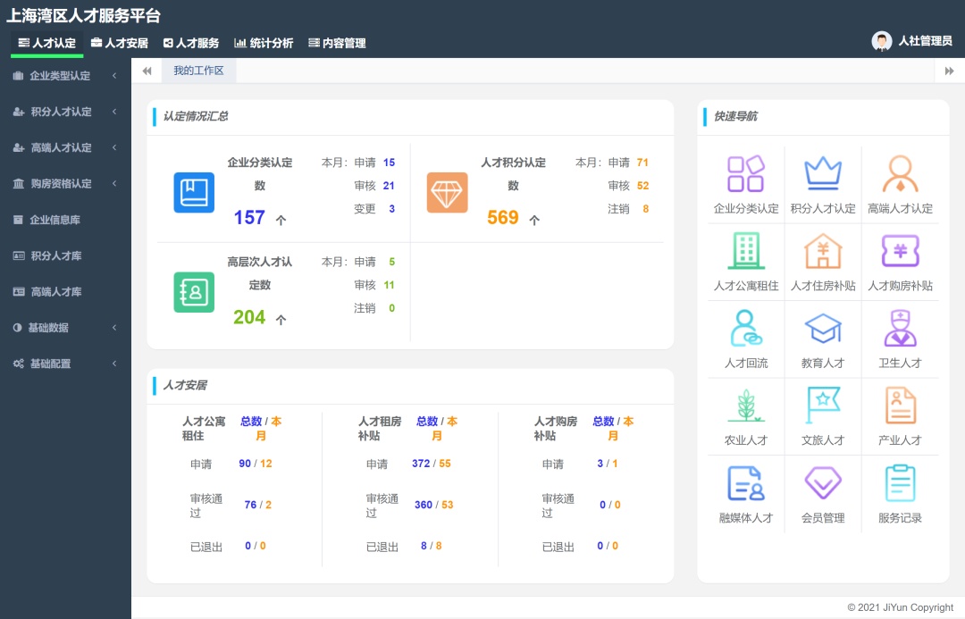 据介绍,上海湾区人才服务平台包括人才政策、人才补贴、人才服务3大模块,涵盖“一网通办”网页端、“随申办”移动端和综合管理端3个端口。“一网通办”网页端面向用人单位,集成人才政策查询、招聘信息发布、人才认定等区内7个部门33个区级人才补贴的申报办理,以及人才公寓信息、人才积分模拟打分等人才服务四大功能模块。“随申办”移动端面向人才,整合36项人才服务,设置我的礼遇、我的咨询、我的申请、我的积分四个模块。综合管理端面向工作人员,业务涵盖受理、审核、公示、资金拨付全过程,配置了办件清单、统计分析等功能模块。