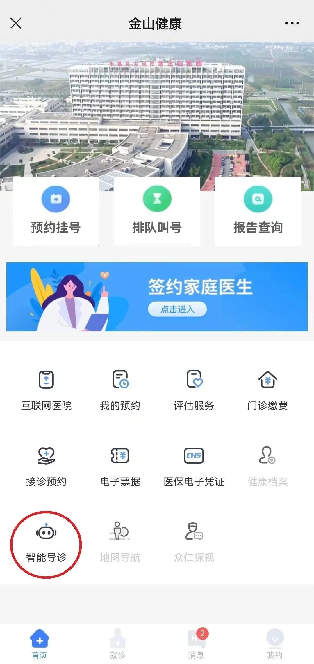 针对门诊就医人群存在“知症不知病”“知病不知科”“找不对医生”的困惑和诉求,“金山健康”微信公众号的“健康服务”模块上开通了“智能导诊”菜单。