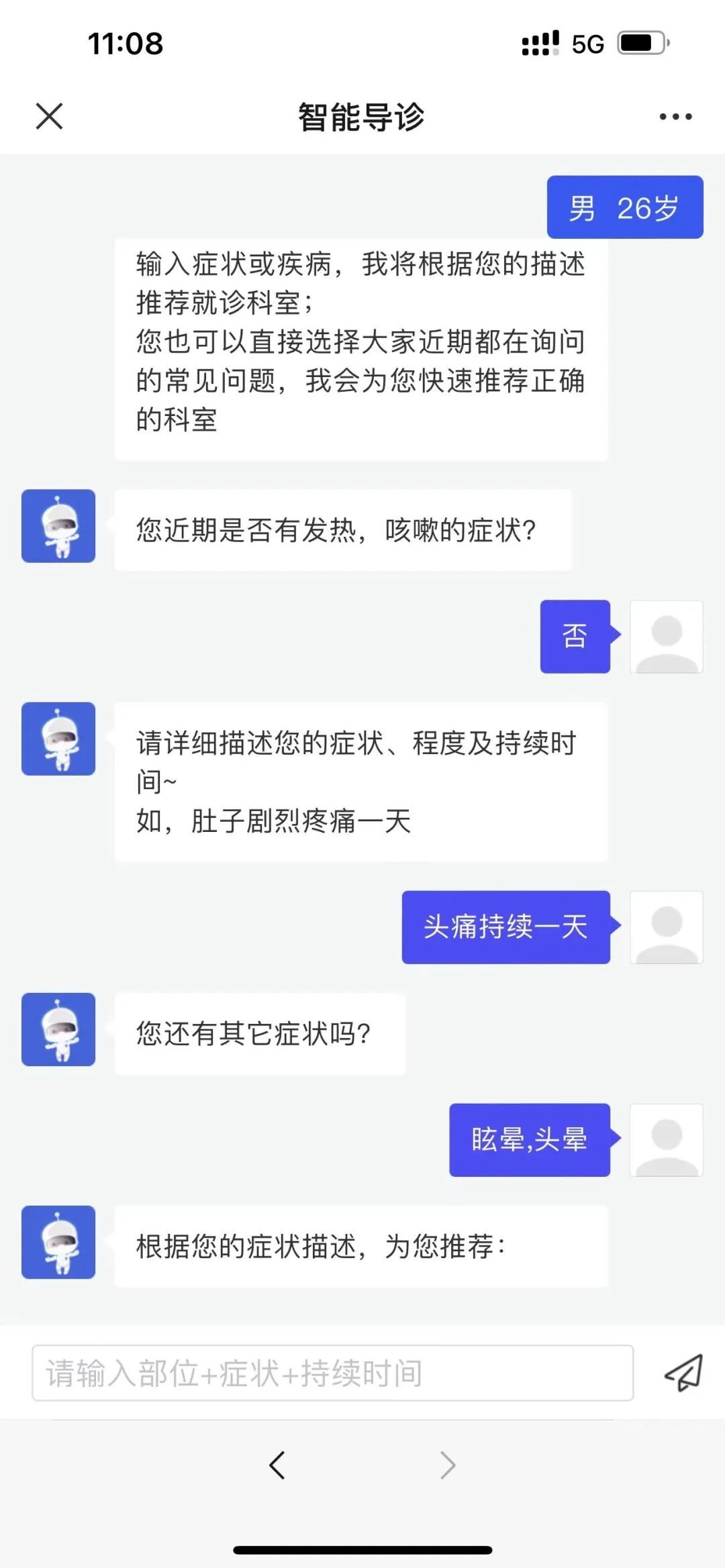 患者可根据提示,进行结构化智能症状问答,系统会通过专业知识库分析患者症状,为患者提供门诊预约就医推荐最优科室或者专家。