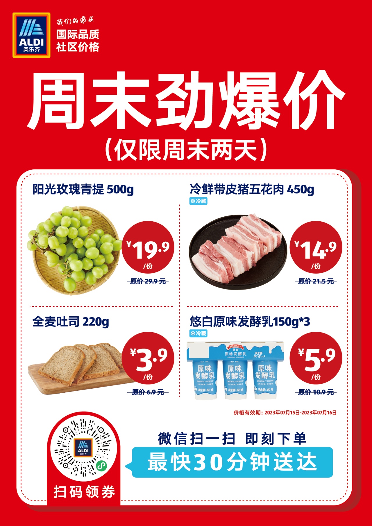 值得一提的是,本周末店内还有“快闪”优惠活动,折扣商品涵盖阳光玫瑰青提、冷鲜带皮猪五花肉、健康低卡的全麦吐司、奥家自牌悠白原味发酵乳等。此外,ALDI奥乐齐新会员活动仍在持续,市民加入会员可优惠购买相关产品。