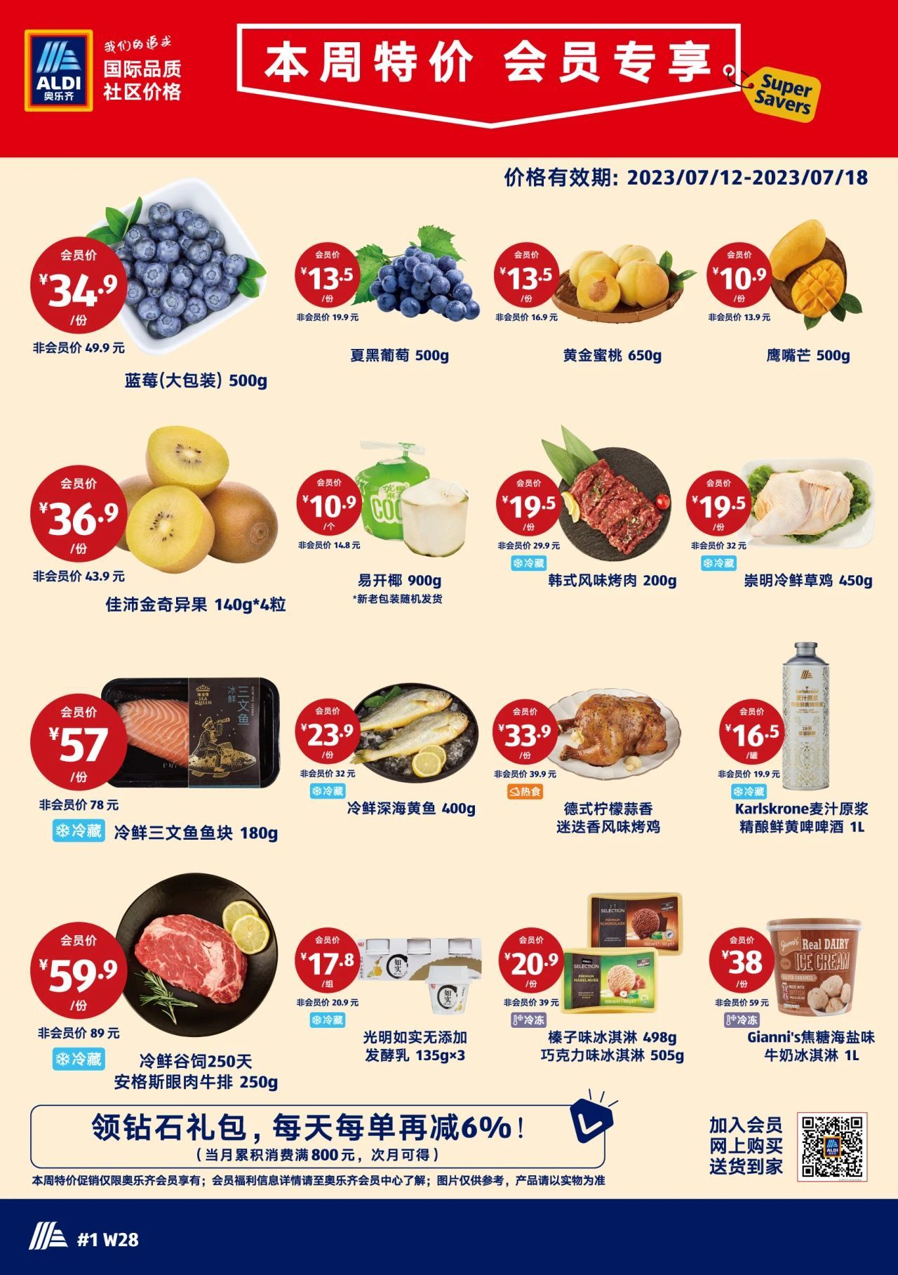 即日起至7月18日,为“超级特价月”的第一轮活动,ALDI奥乐齐甄选了30多款人气产品参与本轮优惠。水果品类中,当季的时令阳山水蜜桃,每颗均有半斤重,4粒装/盒,原价49.9元,现价37.9元;蓝莓500克/盒,原价49.9元,现价34.9元。生鲜方面,800克装的崇明冷鲜童子鸡,原价32元,现价24.9元;180克装的冷鲜三文鱼原价78元,现价57元。