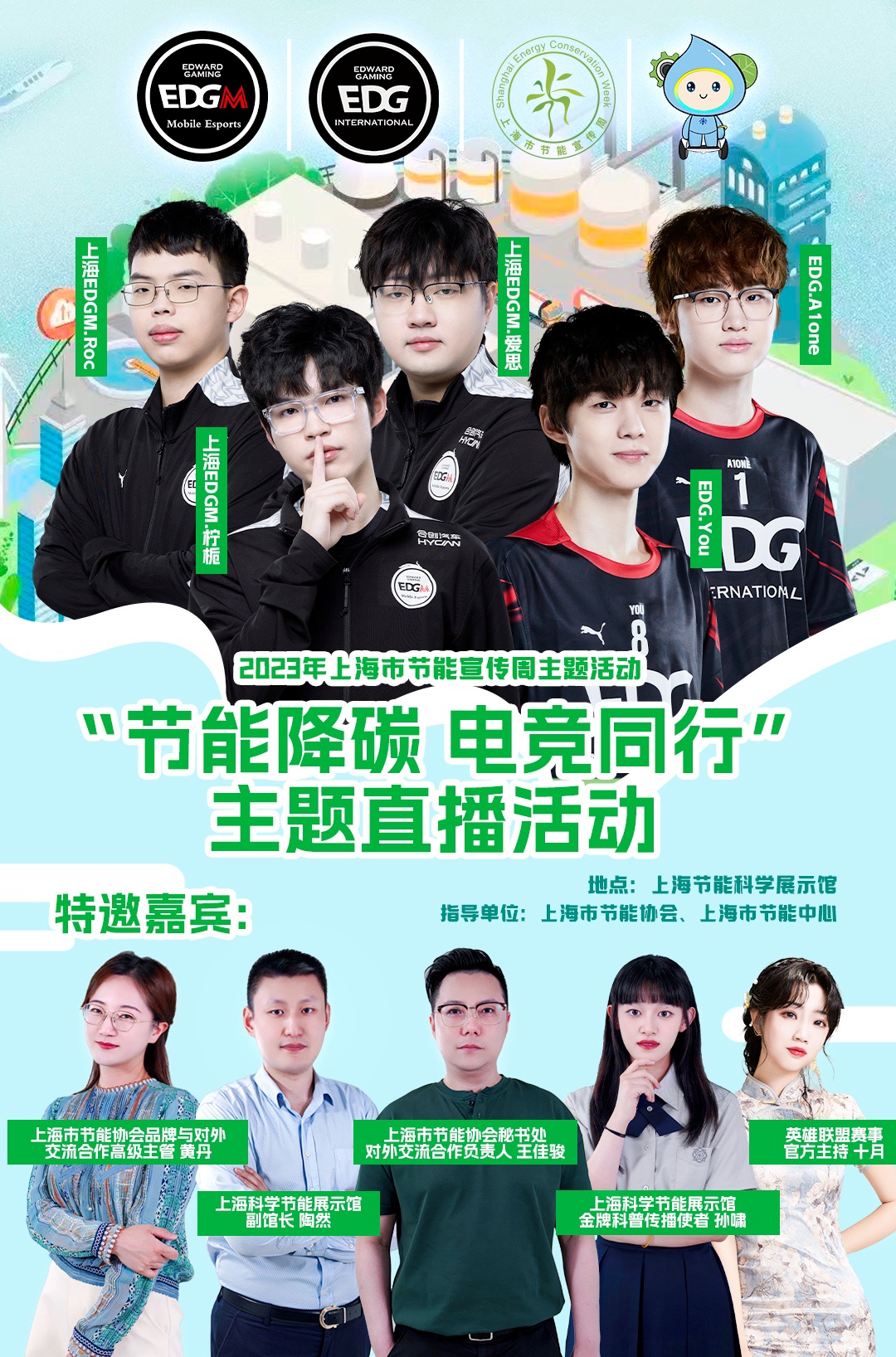 来自上海EDG.M王者荣耀分部和EDG英雄联盟手游分部的5名电竞选手将化身主播,与上海市节能协会、上海市节能中心的专业人士相聚上海科学节能展示馆,就绿色饮食、绿色家居、绿色出行、循环再生等领域的知识技能进行科普,对各类绿色消费品展开形式多样的推介,以期充分调动行业、企业、社会的力量,共同营造浓厚的绿色低碳节能氛围。