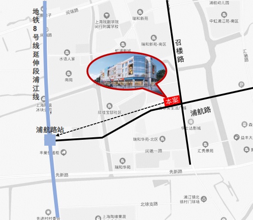 吉乐买生活广场位于召楼路、浦航路路口西北角,距离地铁8号线延伸段浦江线直线距离约1公里,步行约15分钟,总建筑面积近1.3万平方米,商业部分面积超1万平方米。