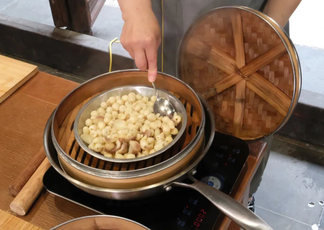 将莲心、百合放入蒸屉,热锅上蒸半小时后压碎至略带颗粒的泥状。