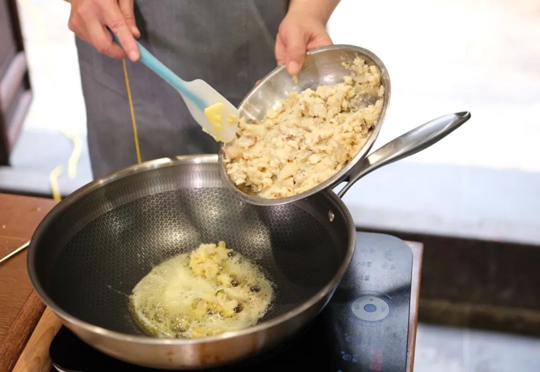 热锅,加黄油,待黄油融化后放入莲心百合泥,按照个人口味加入细砂糖,充分翻炒后出锅冷却。