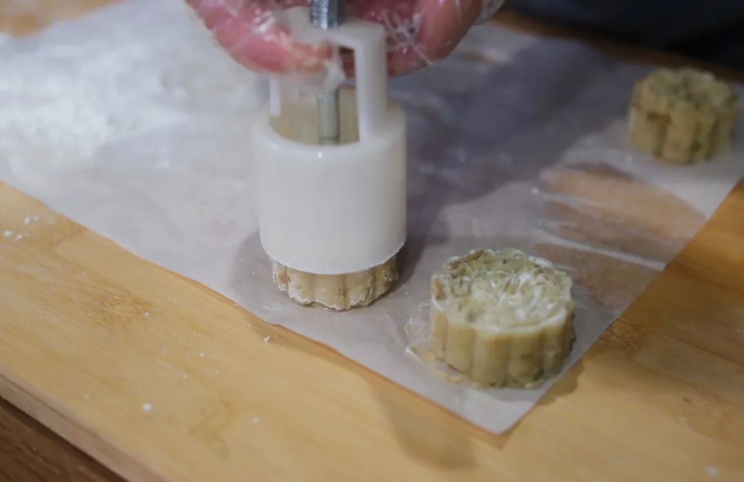 取模型,压制脱膜成型,可放入冰箱冷藏后食用。