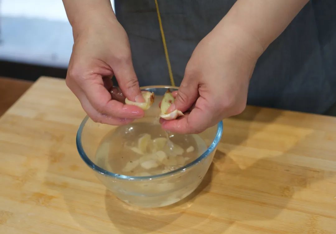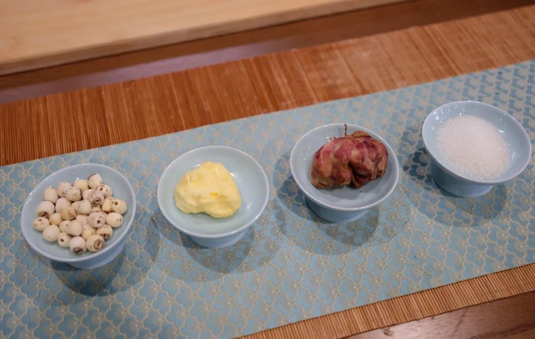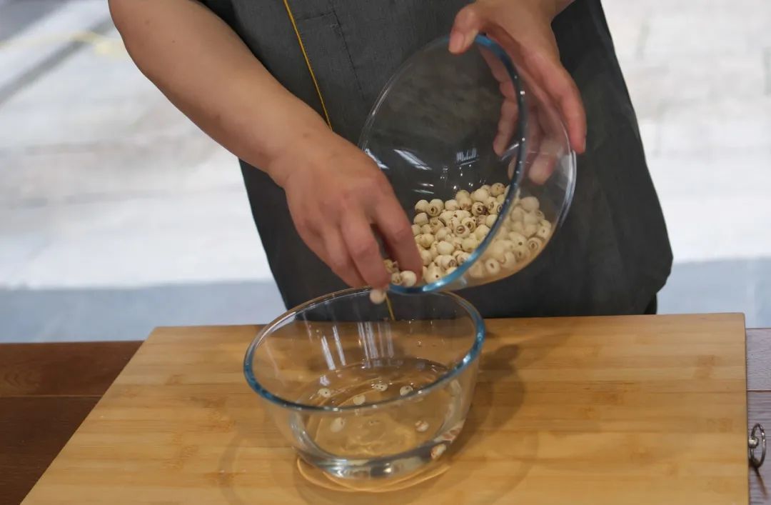 百合剥瓣清洗,莲心泡水约三小时后备用。