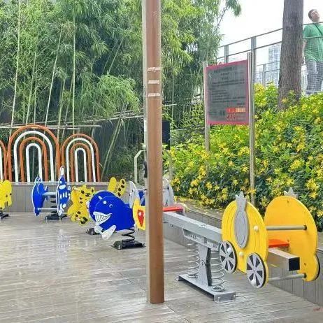 低碳趣味的儿童活动空间选址在中泰公寓东面的健身器材活动区,具有童趣的艺术导视标牌设置在入口处,原本作为路障的弧形栏杆“摇身一变”成为座椅的彩色靠背,同时安装了摇摇马、跷跷板、非动力自行车等小型游乐器材,让场地成为大小朋友的快乐诞生地。