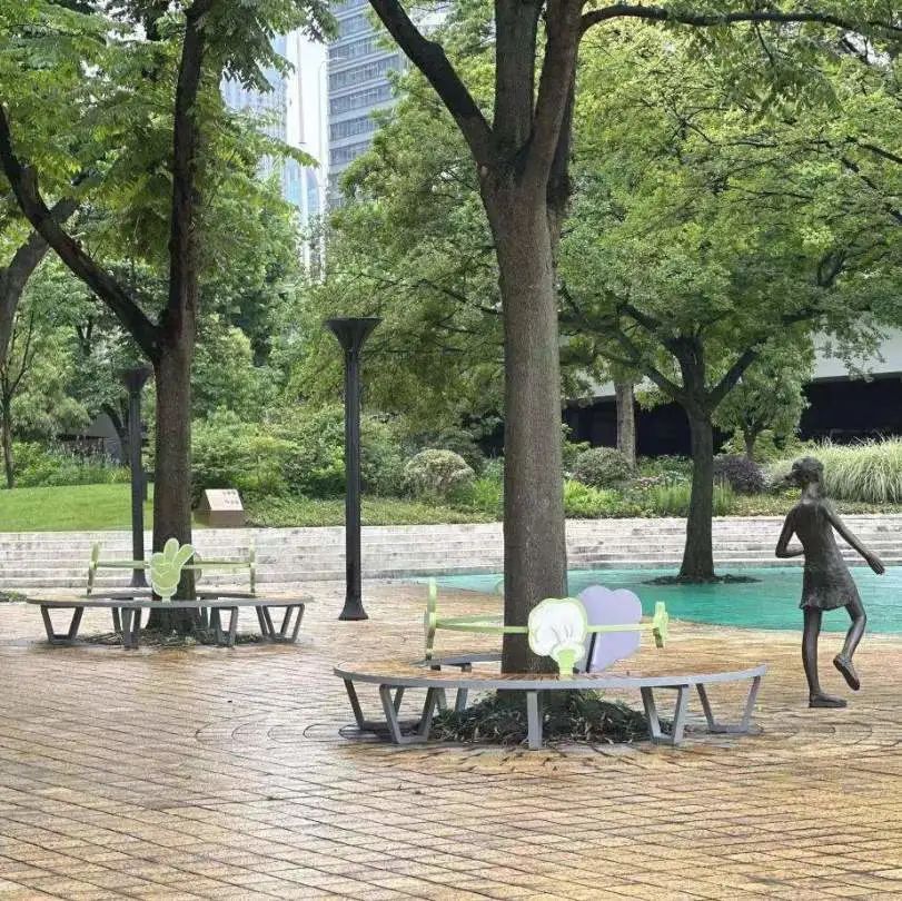 九子公园位于苏州河南岸尽头处,设置了上海民间传统九子健身游戏项目,承载着童年回忆。南京东路街道将与九子游戏息息相关的“石头剪刀布”作为元素形象,融入座椅靠背样式,增强场地的文脉关联及趣味性。
