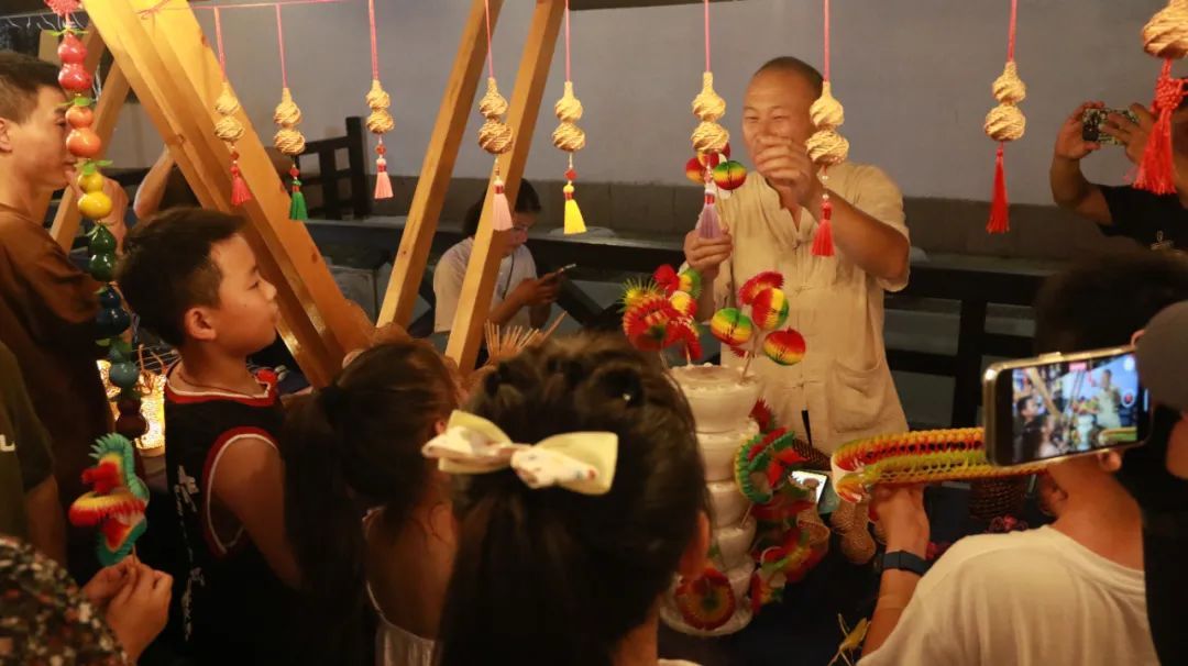 游园会怎么能少得了逛玩。夜幕降临,华灯初上,放眼望去,街头到巷尾,百米长的集市小铺张灯结彩,陈列着各式各样的烧烤小吃、五花八门的手工艺品,还有糖画、翻花等非遗体验,给古朴的老街增添了浓浓烟火气。
