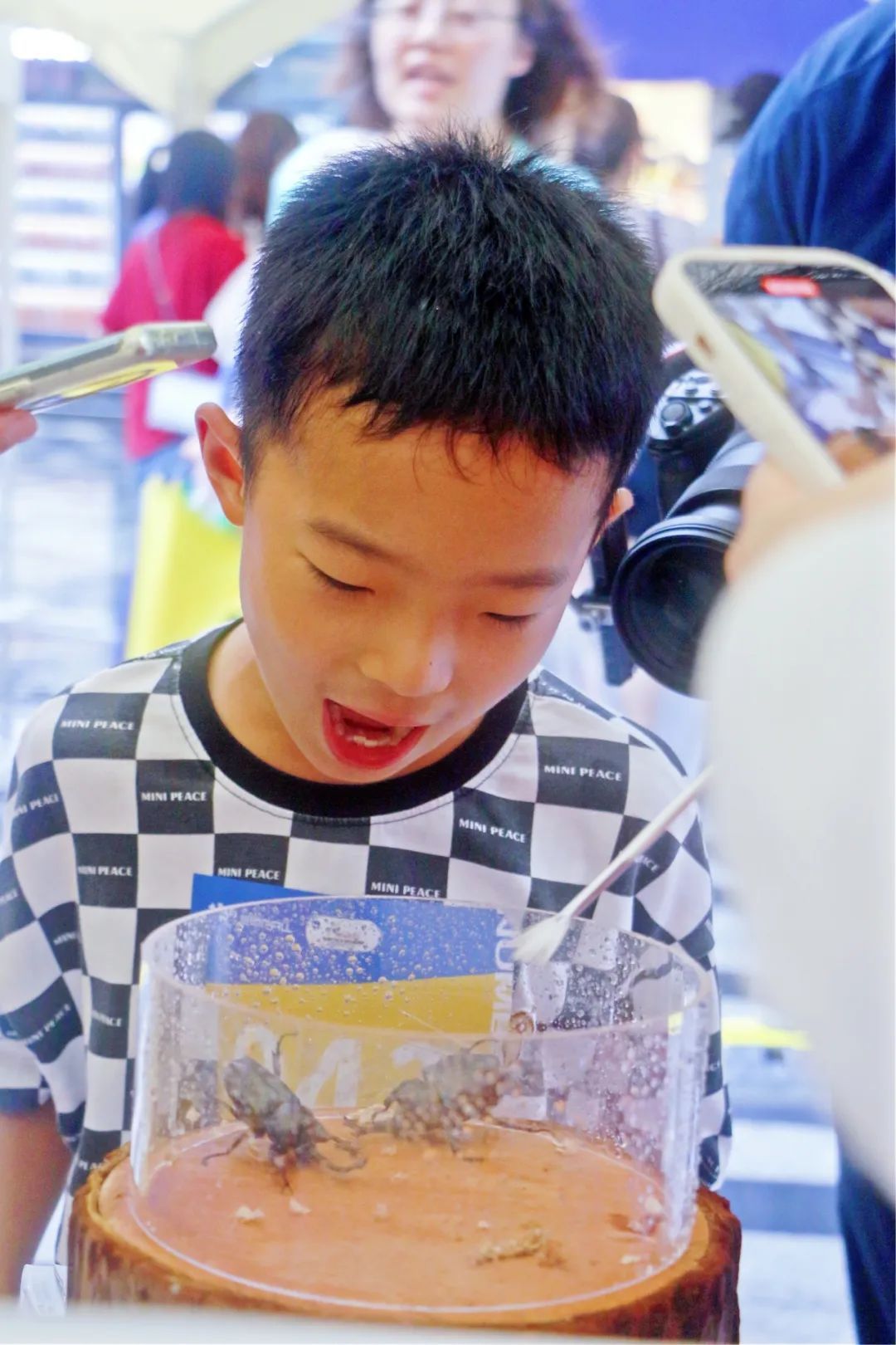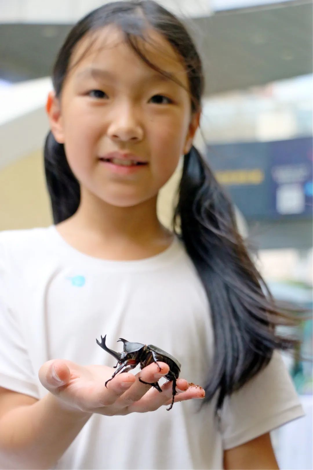 7月15日下午,在位于控江旭辉Mall 广场上的彩虹科学站,一场擂台赛正式打响。现场约100名小朋友带来了他们亲手养大的雄性独角仙。