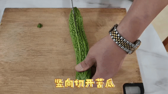 苦瓜洗净对半切开,去除瓜瓤。