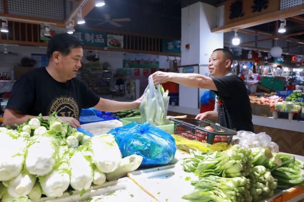 市场外广场的热闹延伸到了市场内。晚上8点,蔬菜经营户王大哥的摊位上,仍有顾客为明天的一日三餐选购。“带来很多人气,一般下午三四点就收摊了,现在晚上八九点钟还有人,给个优惠打个折,能卖出不少呢。”