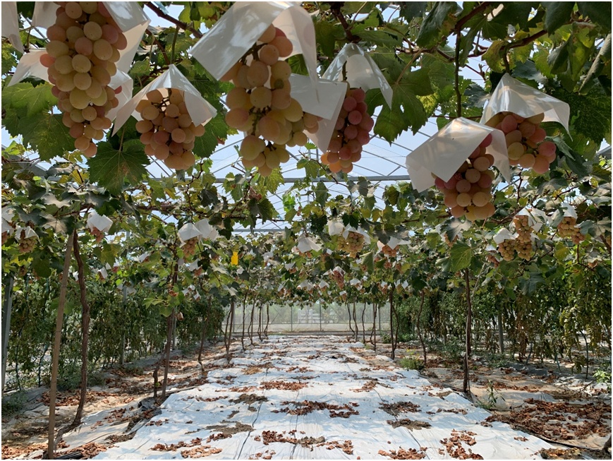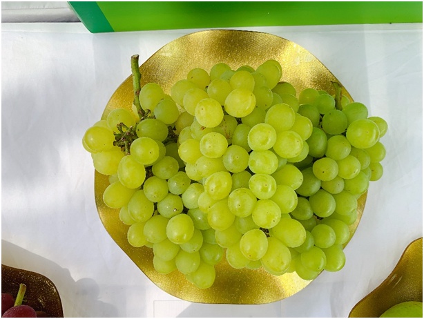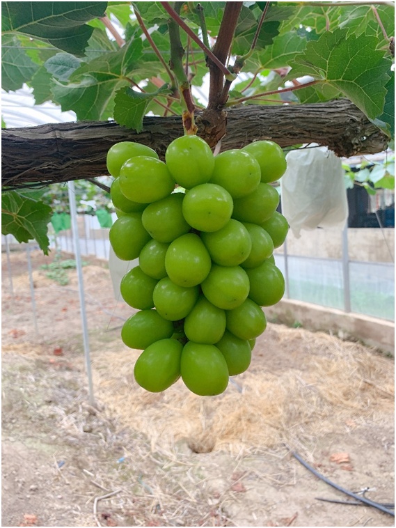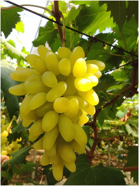中熟品种,果穗大,果穗圆柱形,果皮黄绿色,果粉少,成熟时有亮丽光泽,果肉鲜脆多汁,有淡淡蜂蜜甜味,还有玫瑰和桂花香味,果实糖度高,可溶性固形物含量一般可达17%以上,单粒重12-15克,上海地区促成栽培8月上中旬成熟。