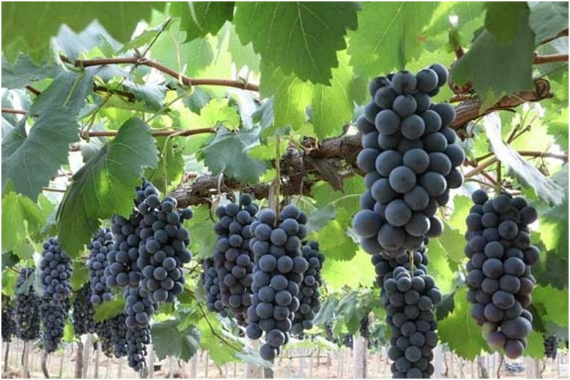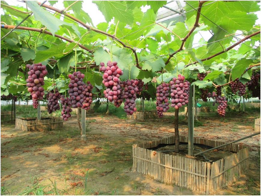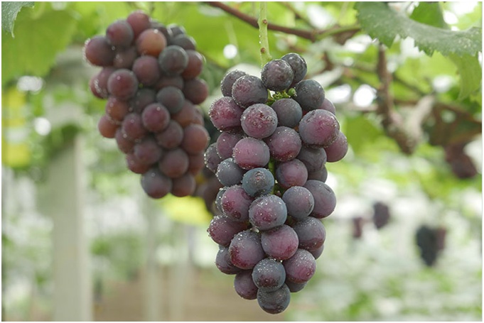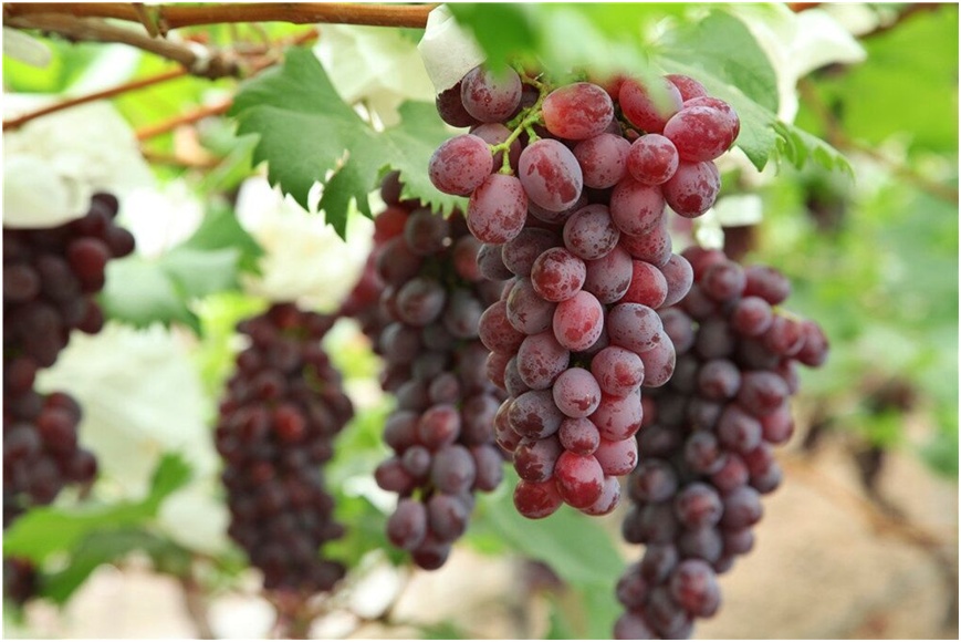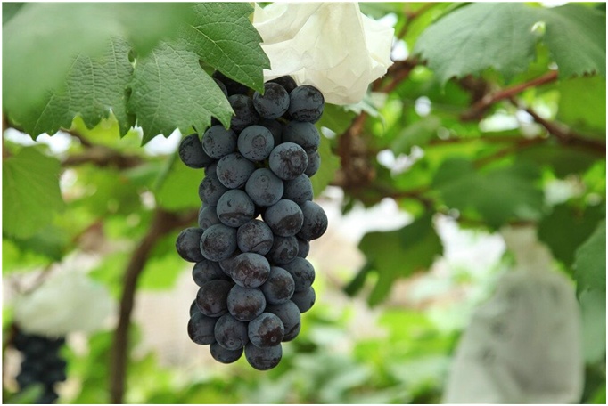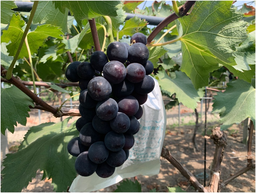 因果粒极大,单粒重可达15-18克,俗称“兵乓球葡萄”,中熟品种,果穗圆锥形或短圆柱形,果皮红紫至紫黑色,果肉肥厚,肉质较软,味酸甜,可溶性固形物含量可达16%以上,上海地区促成栽培7月下旬成熟。