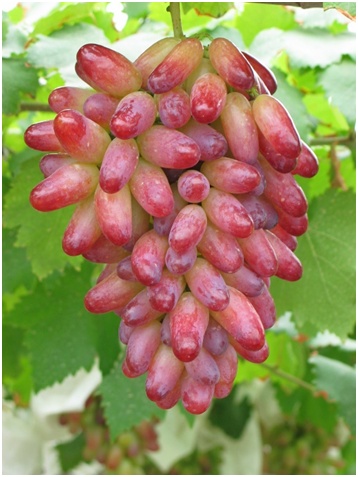中熟品种,果穗大,圆锥形,果皮鲜红色,果肉硬脆,甘甜爽口,有草莓香味,可溶性固形物含量可达19%以上,单粒重15-18克,上海地区8月中旬成熟。
