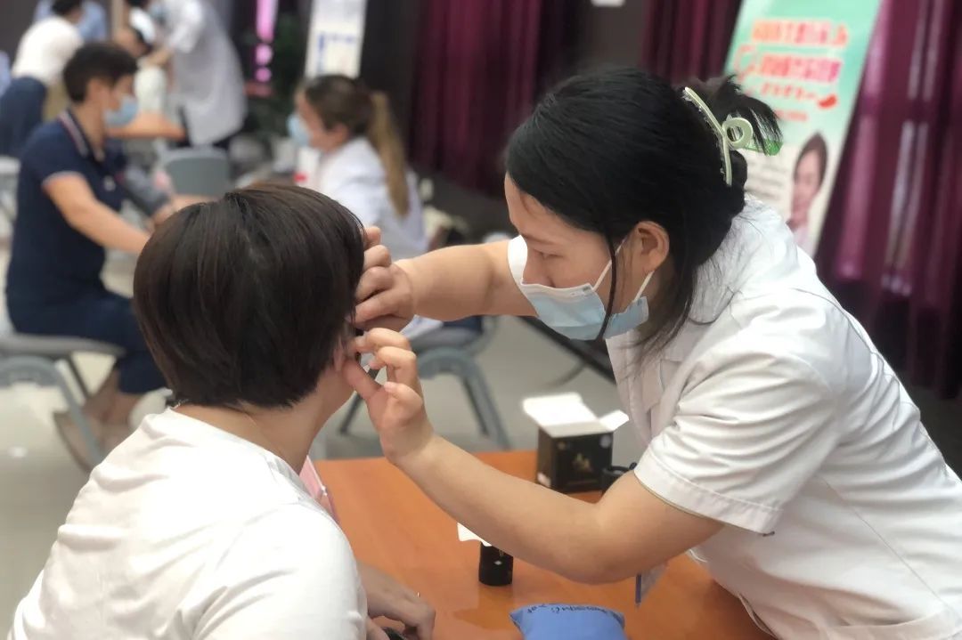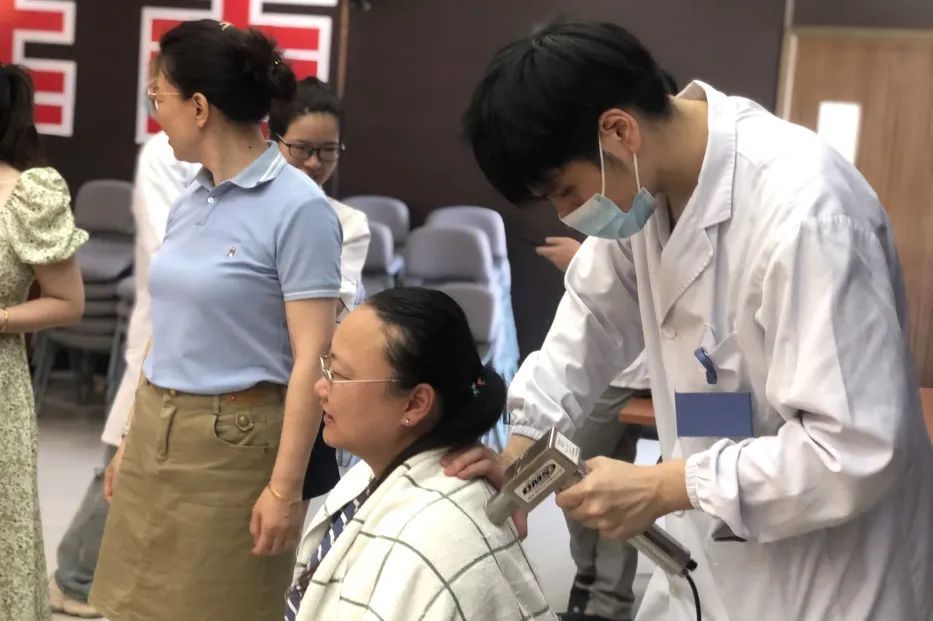 随后,现场开展了健康义诊活动,中医、全科、康复每个摊位前大排长龙,大家轮流体验了DMS筋膜枪、中药封包、穴位艾灸、耳穴贴敷、量血压等项目。