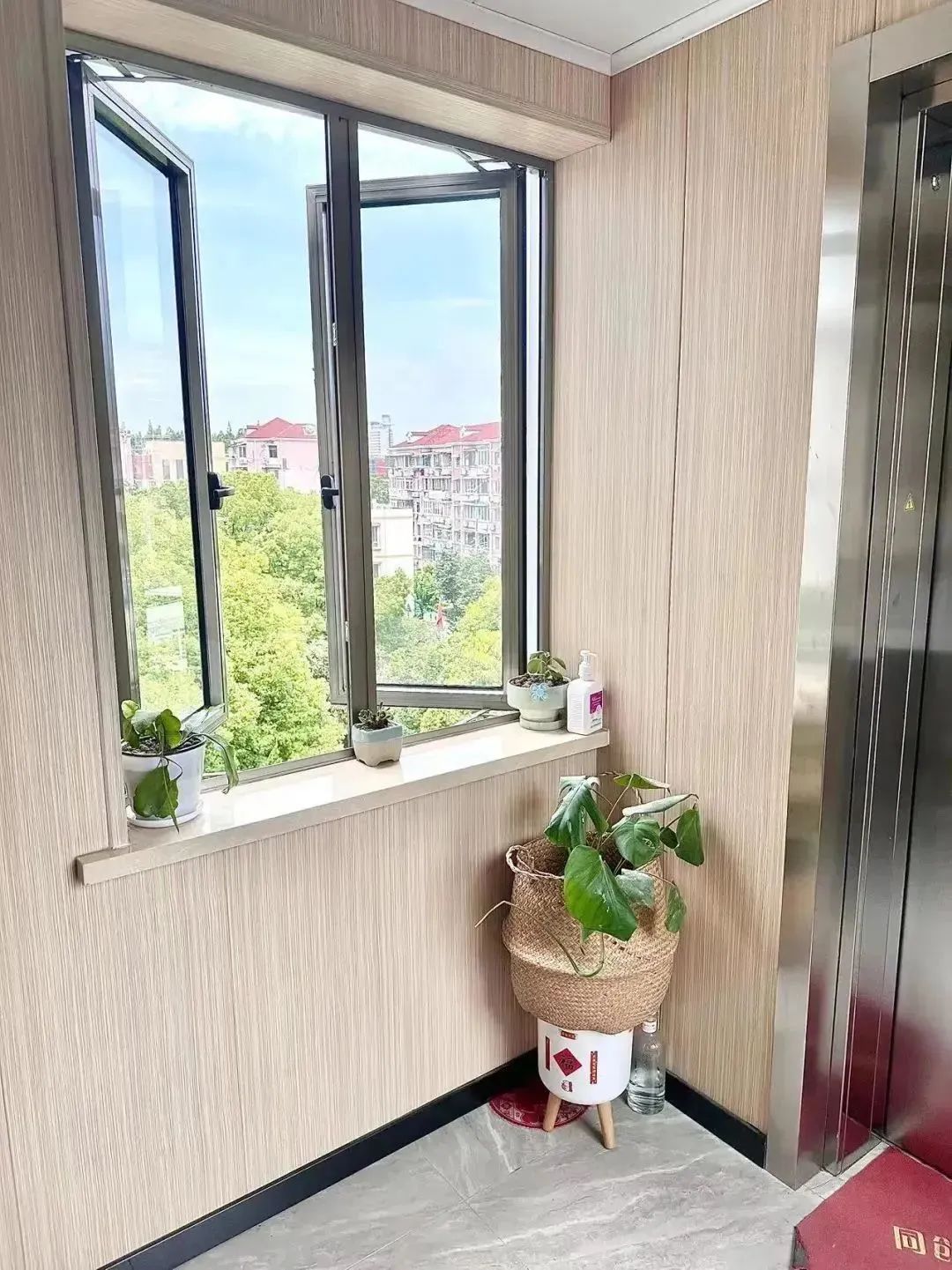 高楼层的居民进出电梯时有着高层独特的视野,会时不时望向窗外,解除一天的疲累。在窗前驻足久了,便自发在楼道打造出电梯转角观景台,为整个楼道增添了一份生机和美感。“从这里望出去就能看到植物园,一片绿意盎然,就像观景台一样!”楼道居民笑着说。