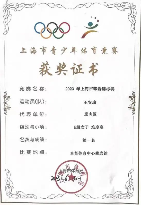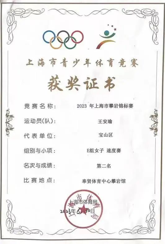 2023年上海市攀岩锦标赛近日在奉贤体育中心攀岩馆顺利举行。参赛小选手们在赛场上不畏困难,坚持遇强则更强的拼搏精神,赢得各位观赛者的频频喝彩,为自身平时刻苦训练呈上一份阶段性的完满答卷。宝山小将王安瑜获得E组女子难度赛第一、速度赛第二,王安瑜年龄刚刚达到最小年龄组别,第一次参加省市级攀岩比赛就能获得佳绩,可喜可贺!