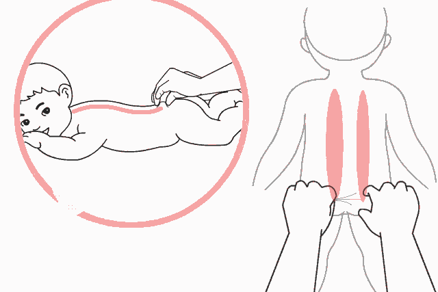 3.每捏3下需将背部皮肤向上提一次,最后用两拇指分别自上而下揉按脊柱两侧3次。