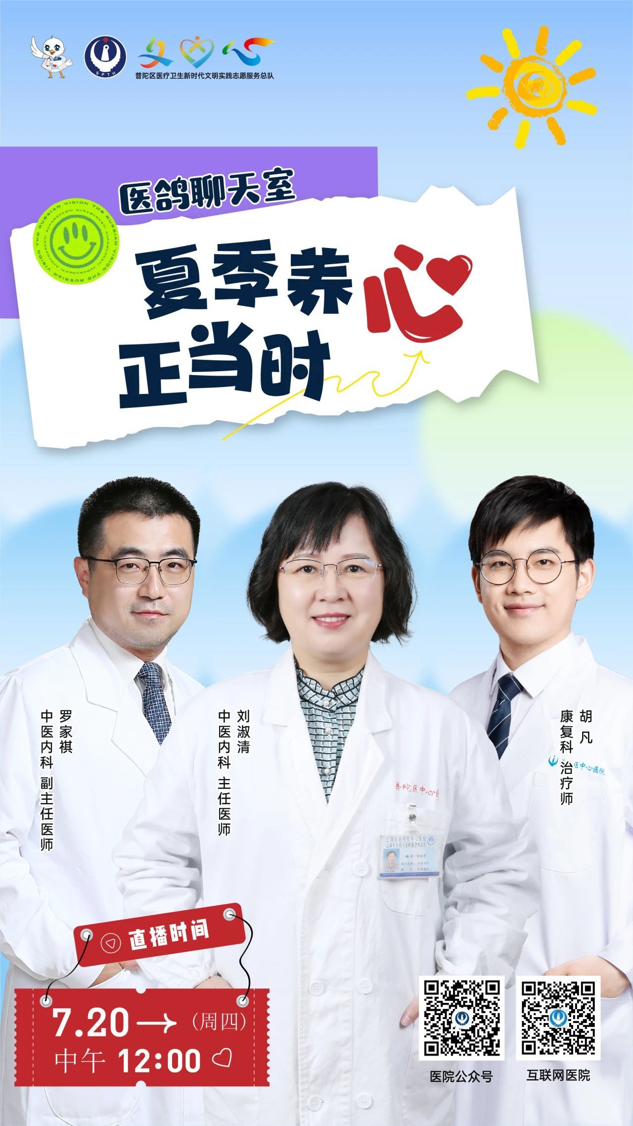 7月20日(周四)12:00,普陀区中心医院5G健康直播间将以《夏季养心正当时》为主题,由中医内科主任医师刘淑清、副主任医师罗家祺、康复科治疗师胡凡一起搭档,带你了解夏季护心养心的小知识。观众朋友们,让我们不见不散~