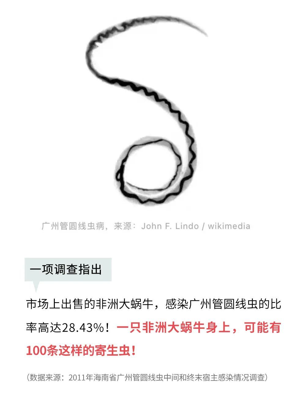 据了解,广州管圆线虫能引起人兽共患寄生虫病。它的终宿主是鼠,中间宿主包括褐云玛瑙螺、福寿螺、蛞蝓(即:鼻涕虫)等。而人是广州管圆线虫的非正常宿主。