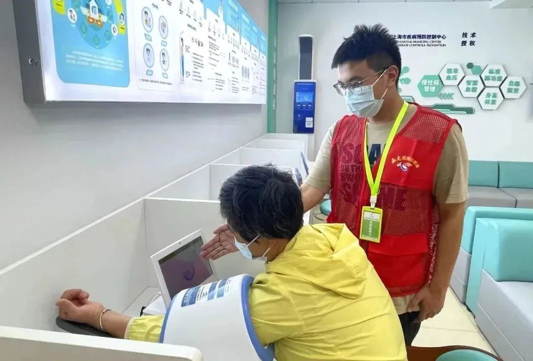 在慢性病健康管理支持中心,上海中侨职业技术大学护理专业的大二学生归骏杰不仅指导患者正确测量血压,还向患者科普健康知识,帮助提升健康管理意识。“来当志愿者能把学到的知识充分运用于实践,毕业后也能更快适应医院的工作。”归骏杰说。