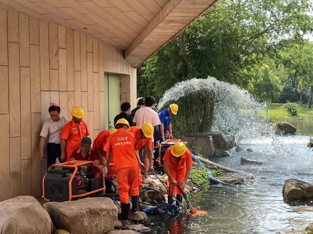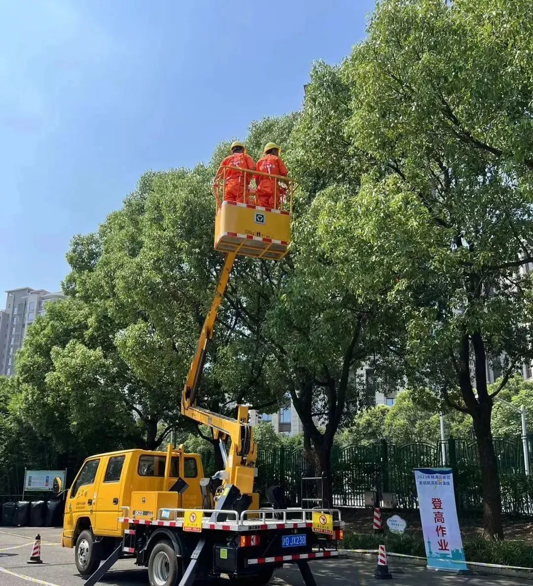 此次演练设置4个项目:小区积水点抢排、树木支撑加固、危墙支撑和登高作业。抢险队伍及时赶到积水处,使用抽水设备将积水排出;使用木棍和铁丝等,对树木进行支撑固定;面对有倾倒危险的房屋墙体,使用木质材料进行墙体支撑;针对多层房屋外立面存在的坠落隐患,使用登高车对隐患进行排除……