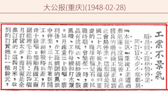 1948年2月《大公报》(重庆)报道顺昌铁工厂概况